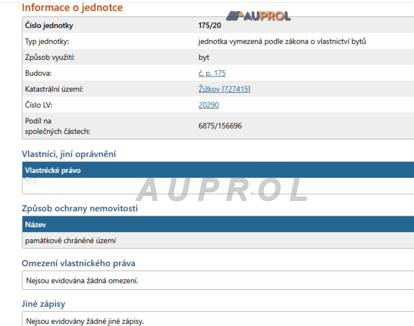 Z KATASTRÁLNÍHO ÚŘADU - Byt 2+kk, Prokopovo náměstí č. p. 175, LV 20290, stavba na pozemku č. 740, č. jednotky 175/20, podíl na spol. část. 6875/156696, KÚ Žižkov (území Hlavního města Prahy);727415