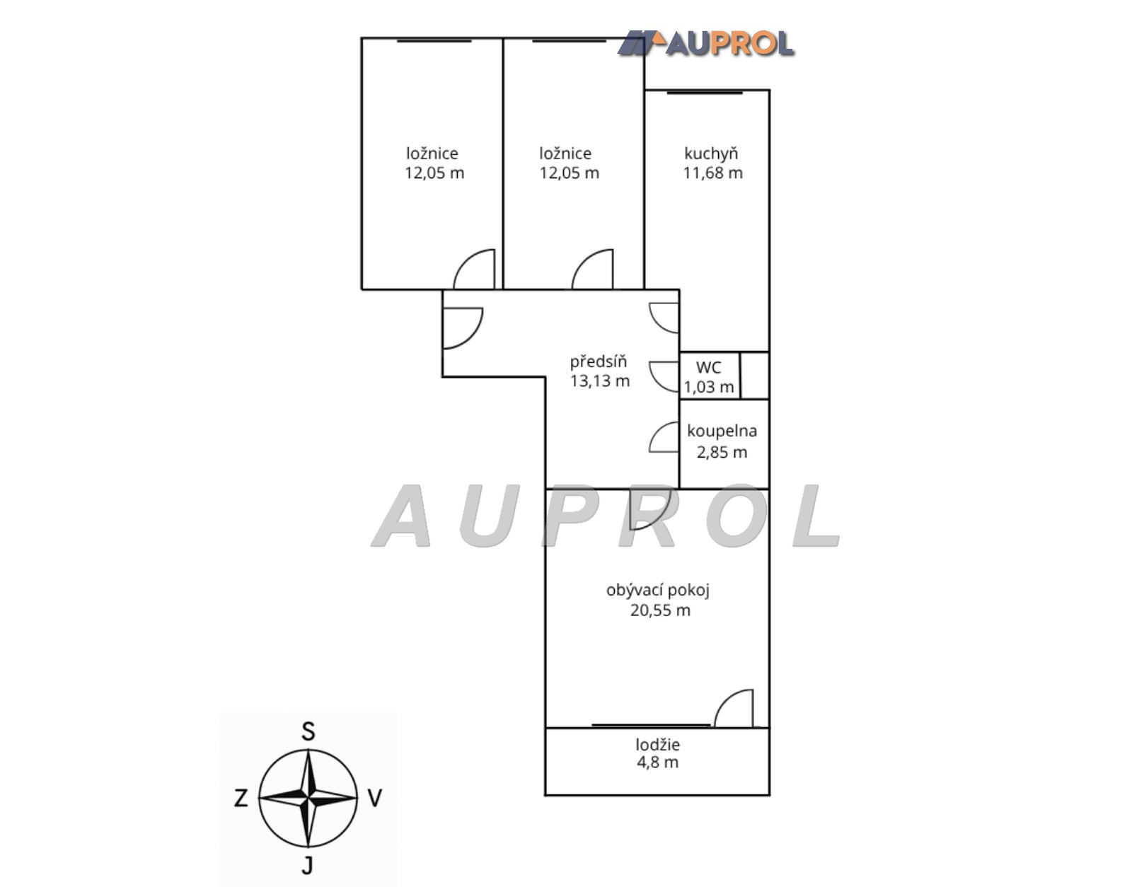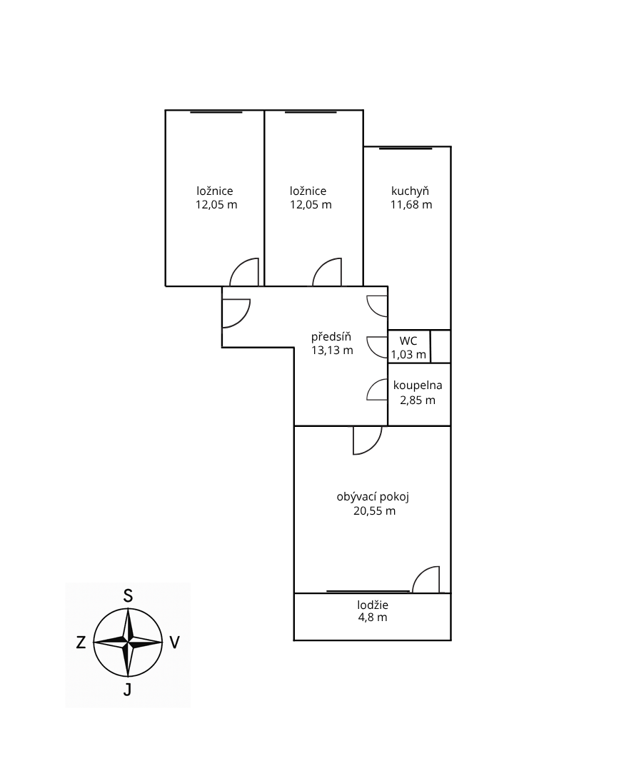 DISPOZICE – předsíň 13,13 m2, obývák 20,55 m2, lodžie 4,8 m2, ložnice 12,05 m2, 2. pokoj 12,05 m2, kuchyň 11,68 m2, koupelna 2,85 m2, WC 1,03 m2, sklep 2 m2
