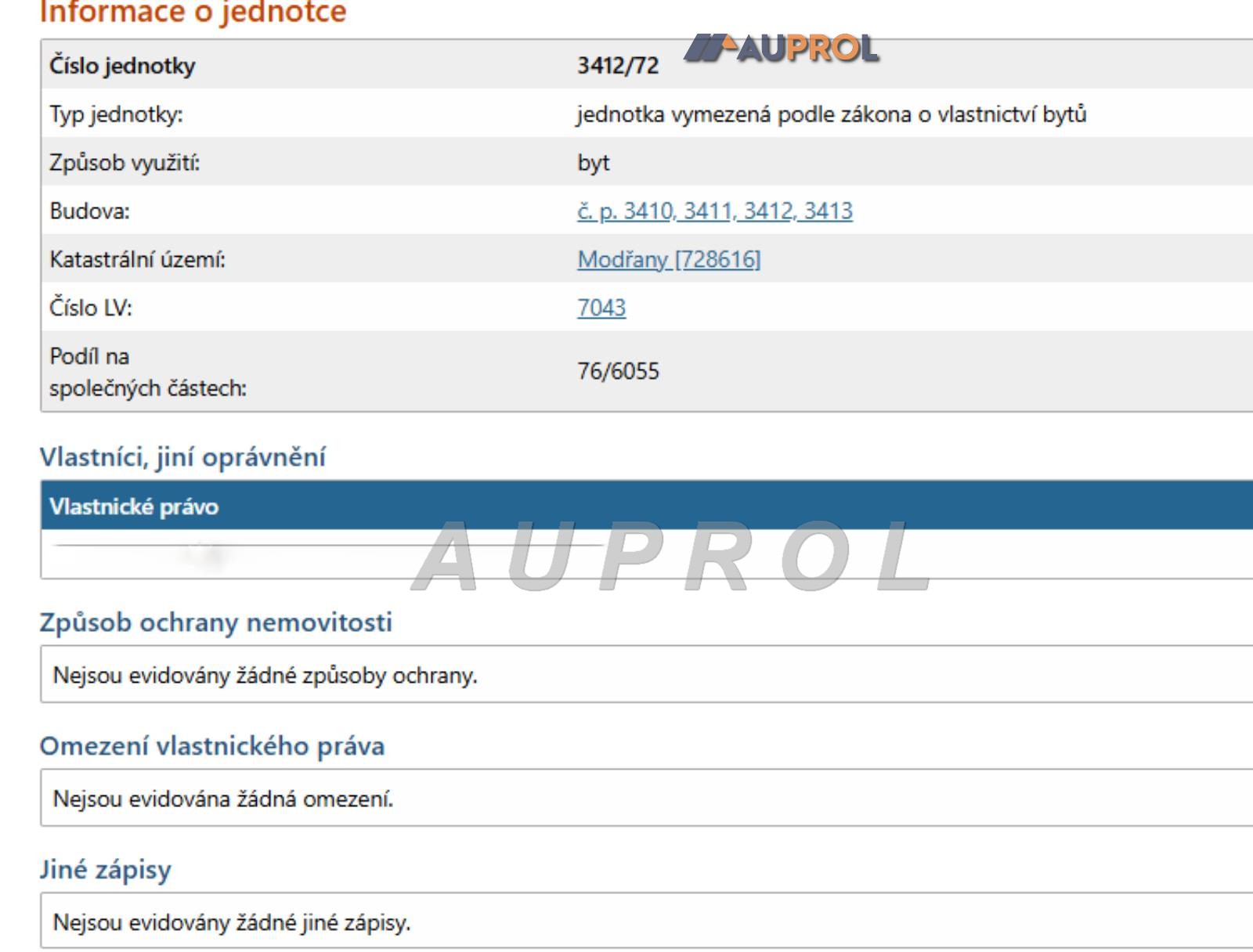 Z KATASTRÁLNÍHO ÚŘADU - Byt 3+1, Vitošská č. p. 3412, LV 7043, pozemek p. č. 4400/328 jehož součástí je stavba č. p. 3410, 3411, 3412, 3413, č. jednotky 3412/72, podíl na spol. část. 76/6055, KÚ Modřany (území Hlavního města Prahy);728616