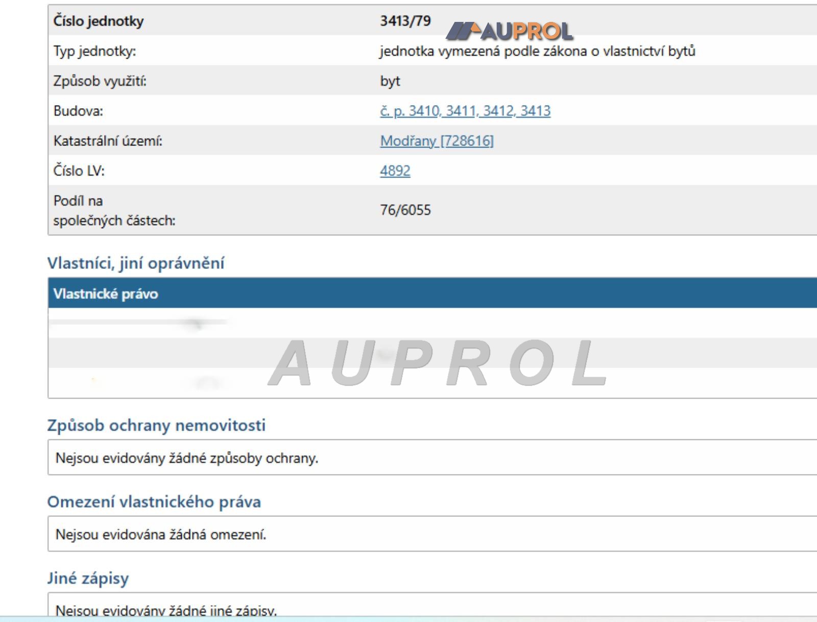 Z KATASTRÁLNÍHO ÚŘADU - Byt 3+1, Vitošská č. p. 3413, LV 4892, stavba na pozemku p. č. 4400/328, jehož součástí je stavba č. p. 3410, 3411, 3412, 3413, č. jednotky 3413/79, podíl na spol. část. 76/6055, KÚ Modřany (území Hlavního města Prahy); 728616