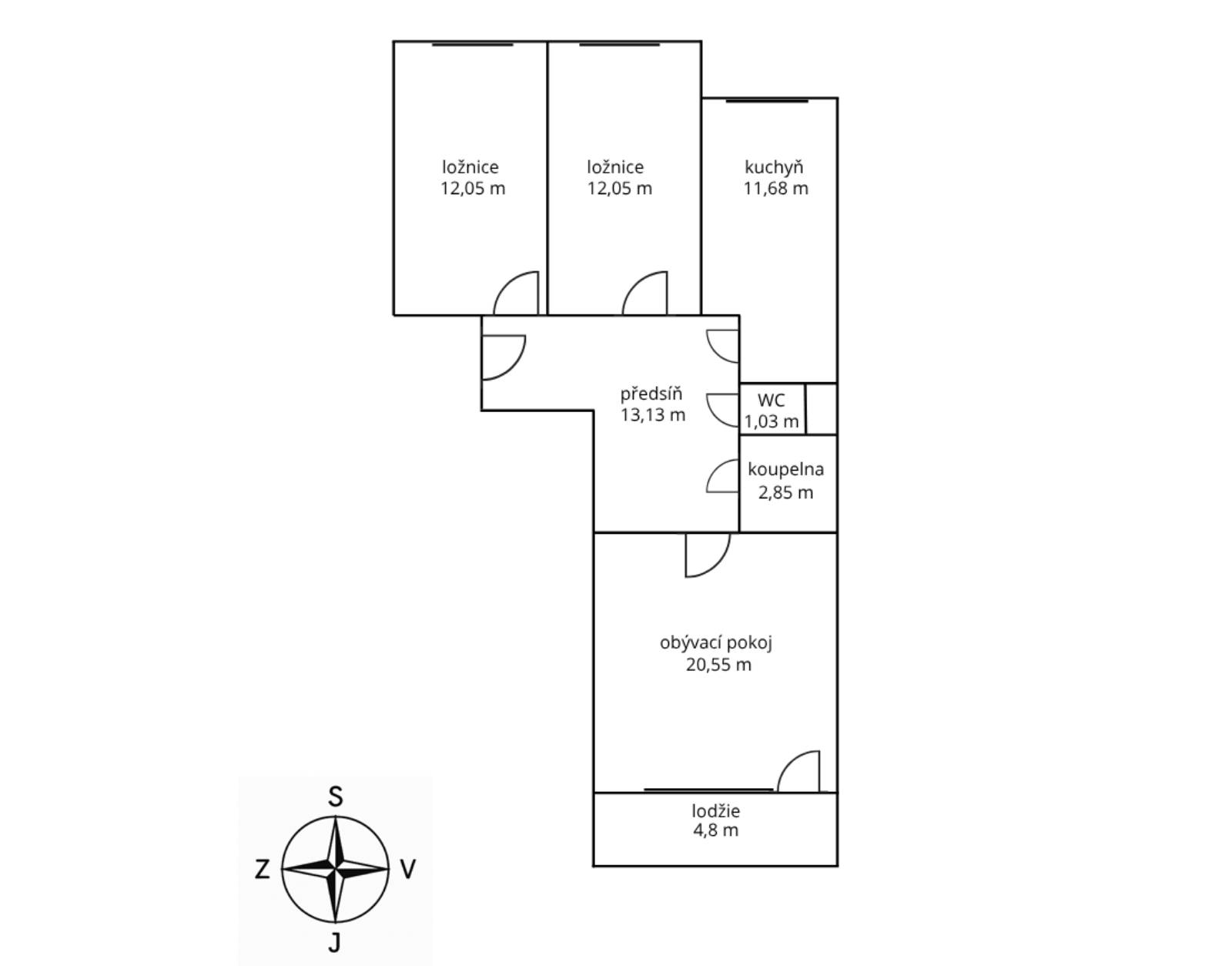 DISPOZICE – předsíň 13,13 m2, obývák 20,55 m2, lodžie 4,8 m2, ložnice 12,05 m2, 2. pokoj 12,05 m2, kuchyň 11,68 m2, koupelna 2,85 m2, WC 1,03 m2, sklep 2 m2, možnost dvougaráže cca 50 m2